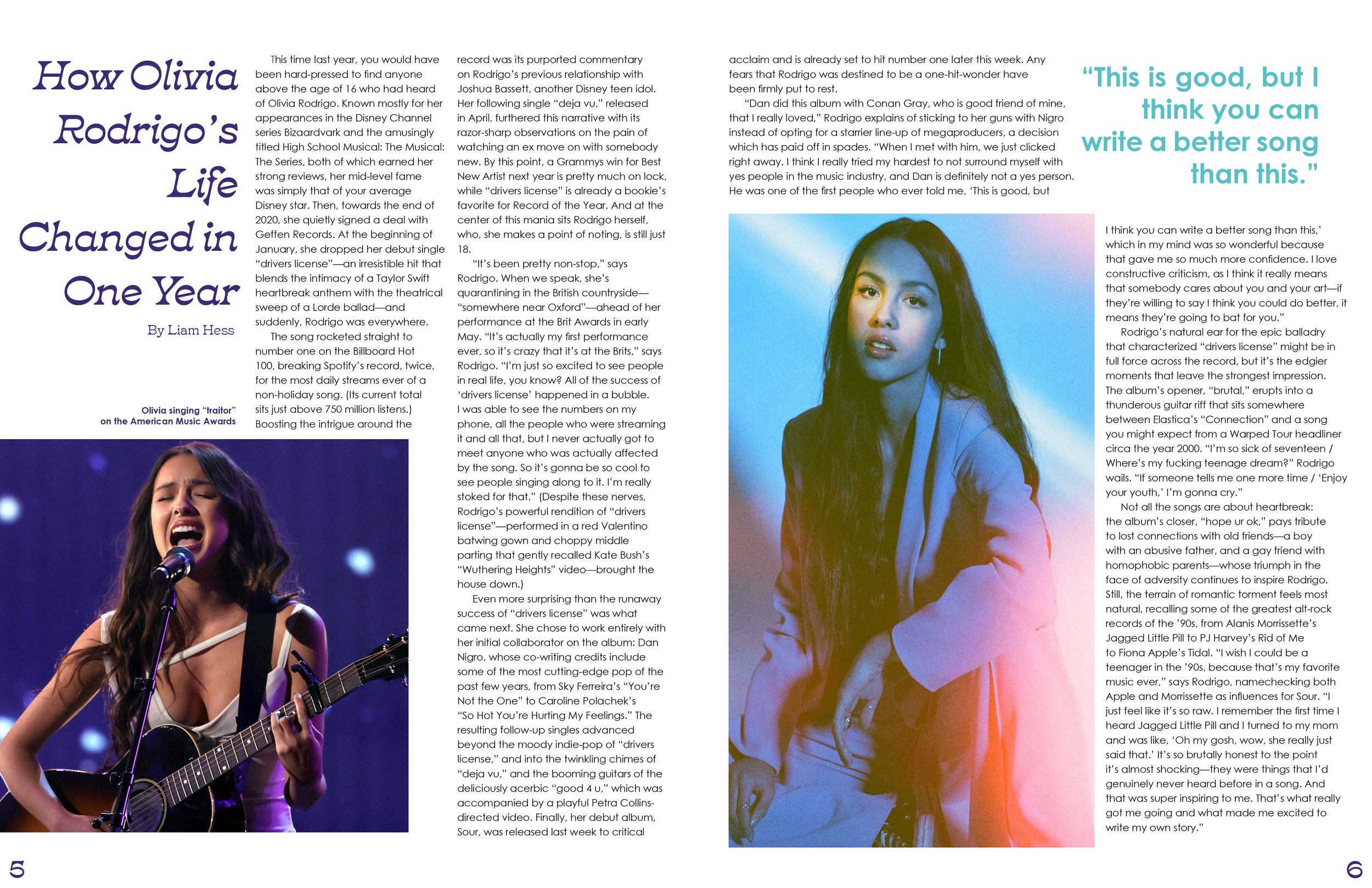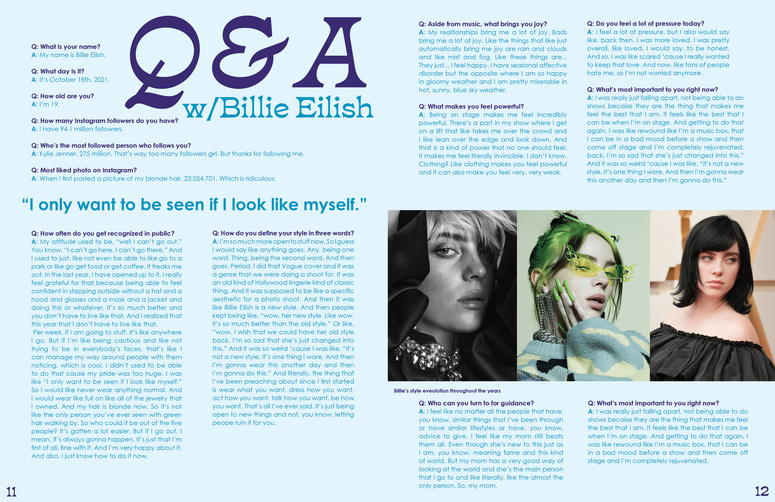 For the Magazine Project, we were in charge of creating a magazine of our choice. I ended up creating a magazine called “Tomorrow Today.” The magazine was about Olivia Rodrigo and Billie Eilish, two of today’s biggest, young singers.
